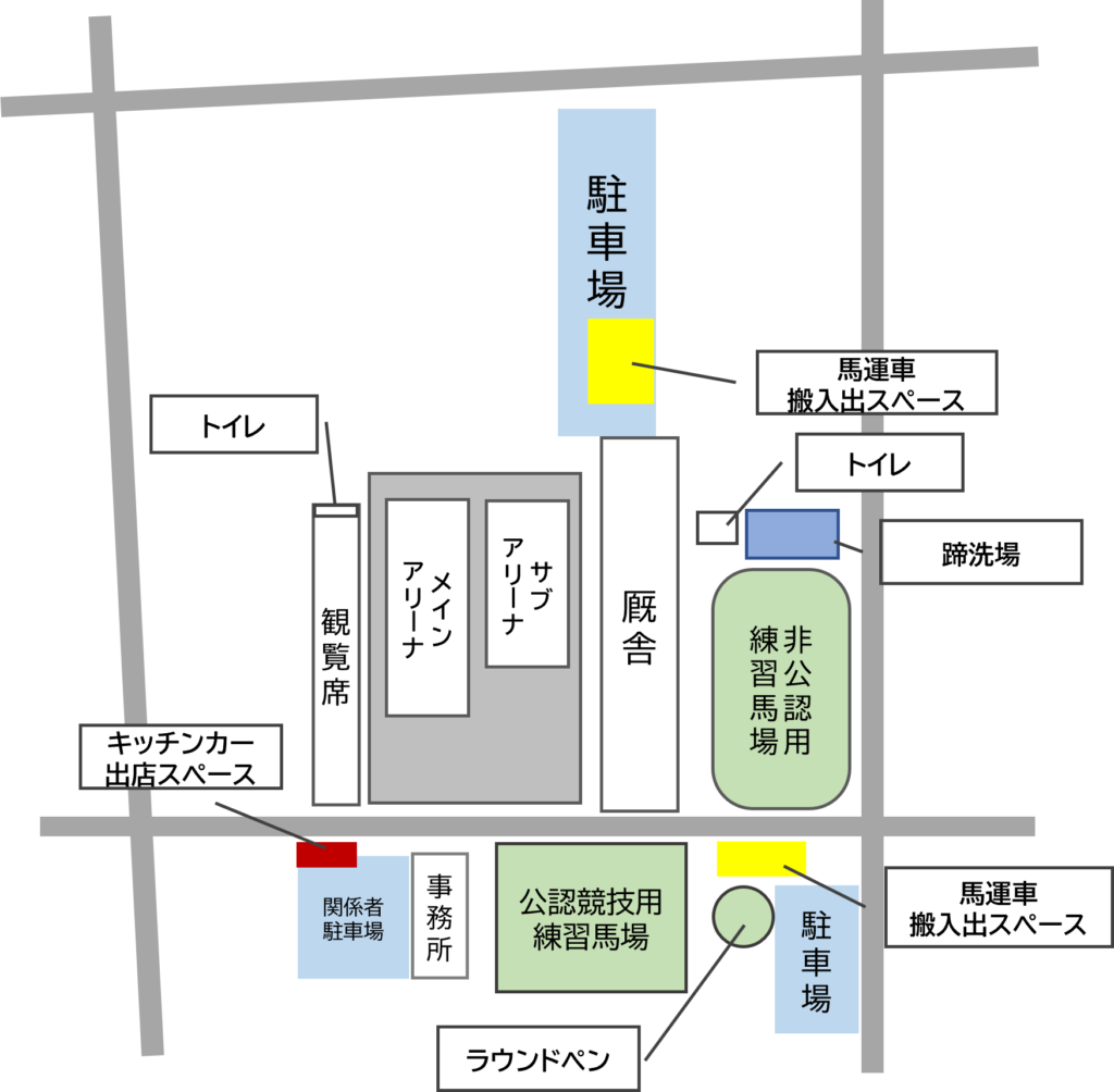 ラウンドペンの他、非公認競用練習馬場で行えます。